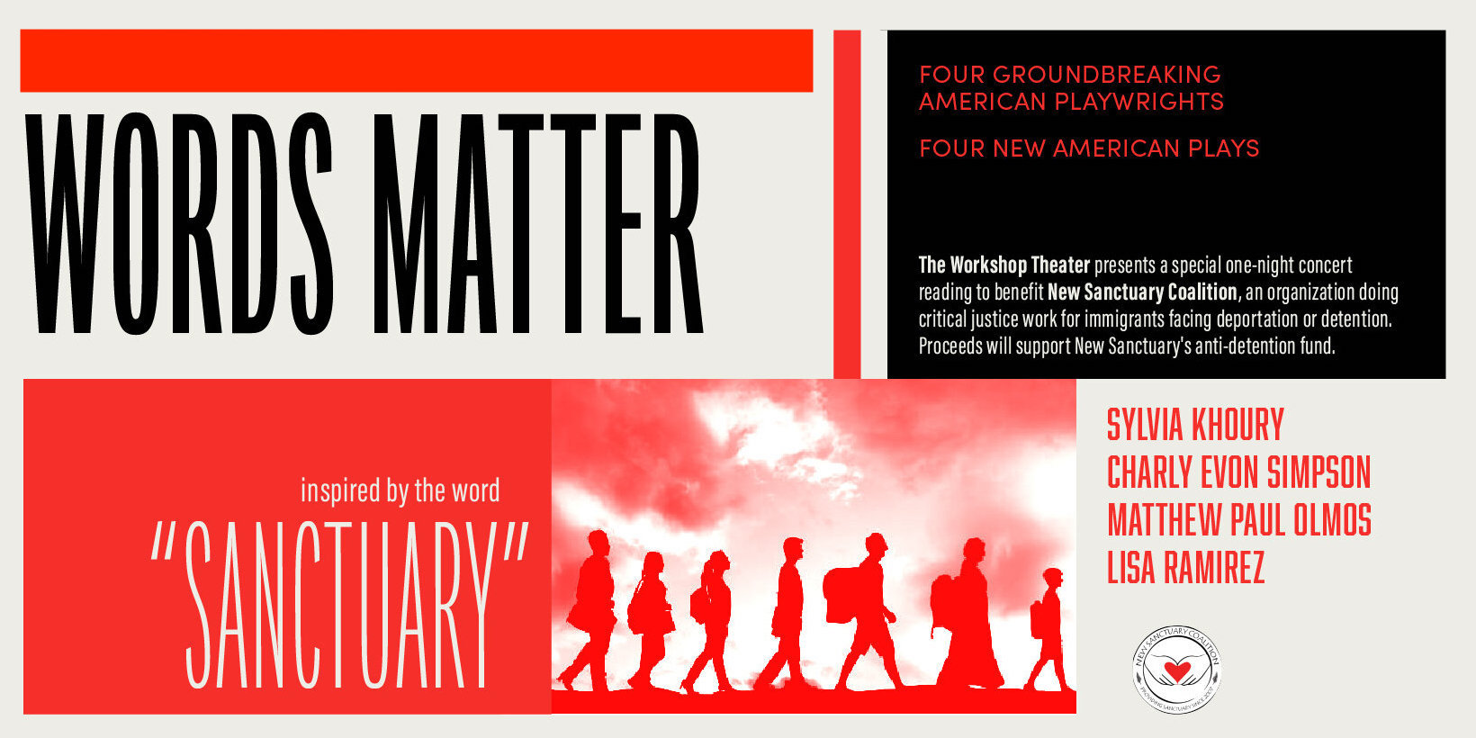 Join us Thursday October 1 at 7 p.m. as The Workshop Theater presents a special one-night concert reading to benefit New Sanctuary Coalition's anti-detention program. A donation of any amount gets you admission to the livestream of the plays AND a talkback with some of the actors, playwrights, and NSC's own Andres Jimenez. If you make a donation and are unable to watch the Oct, 1 streaming event, you'll receive a link to watch the performance anytime between October 2 and 5.